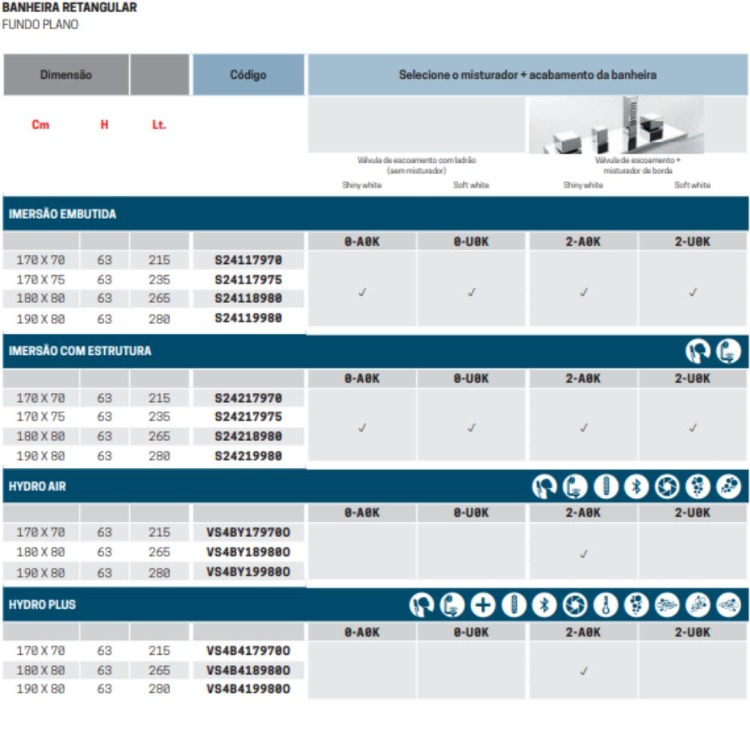 | Instruções diversas | Dimensões: 170x70 (215 litros) / 170x75 (235 litros) / 180x80 (265 litros) / 190x80 (280 litros) | Altura:63cm | Modelo com disponibilidade de estrutura Funcional em Aço, Hidromassagem, Air Massage, Body Massage ou Back Massage |