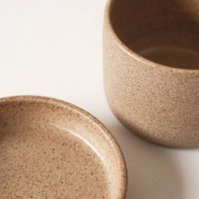 Jogo de prato médio, copo e pires em bege acetinado, com pintas discretas espalhadas por toda a peça. Feito em cerâmica, pintado à mão e queimado em alta temperatura. Perfeito do café da manhã até a pausa no meio do dia.