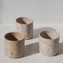Copo pequeno em tom branco acetinado, com pintas grandes e marcantes. Feito em cerâmica, pintado à mão e queimado em alta temperatura.
