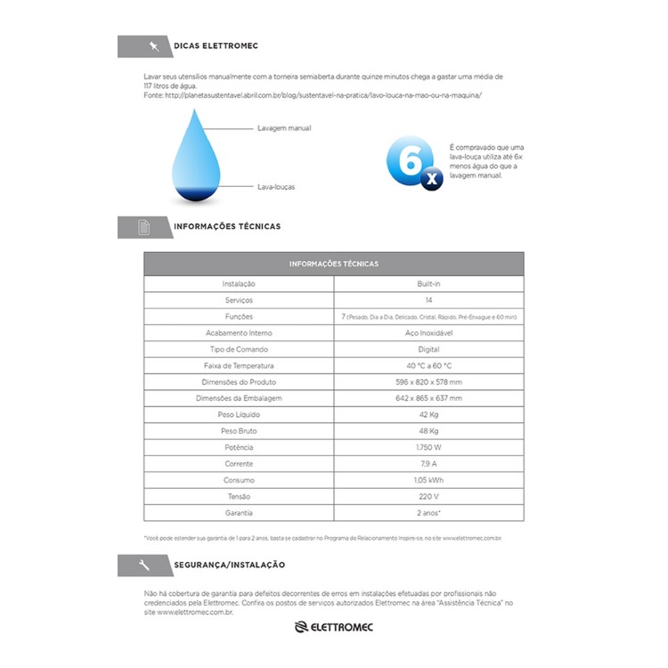 | Instruções diversas | *item opcional para ser comprado junto com a Lava-Louça 14 Serviços sem revestimento 220V Elettromec* |